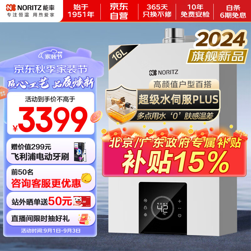 能率(NORITZ)【小云朵】16升燃气热水器 天然气 变频水伺服恒温 下置风机 综合降噪 GQ-16EA3AFEX以旧换新价格:3399.00元!