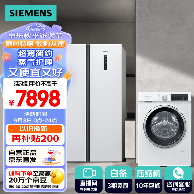 西门子(SIEMENS)冰洗套装502L超薄嵌入对开门冰箱+10kg洗烘一体KA50NE20TI+WN52A1004W价格:7898.00元!